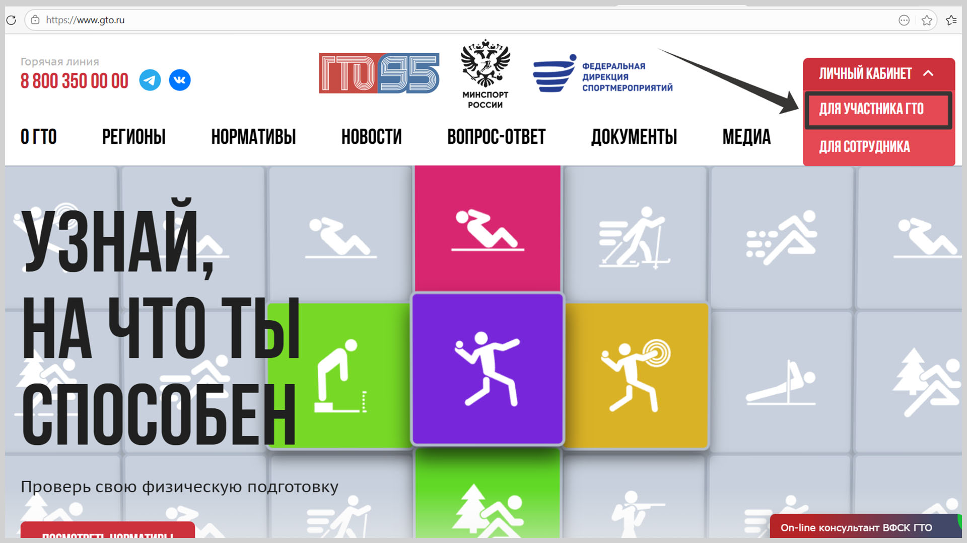 В выпадающем меню — «Для участника ГТО».