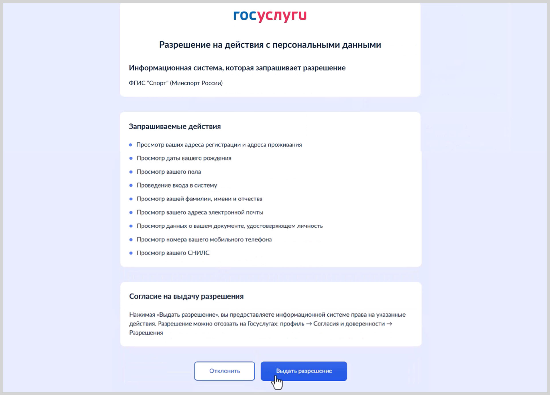 Предоставьте информационной системе права на просмотр ваших данных нажав кнопку «Выдать разрешение».
