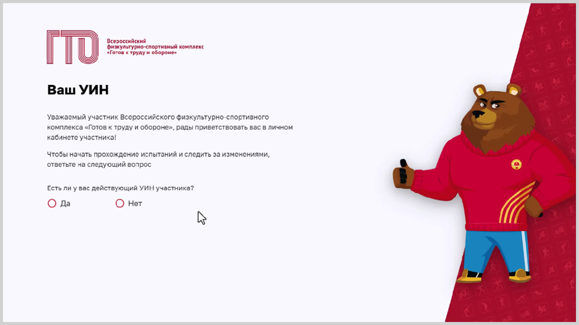 После выдачи разрешений откроется сайт ГТО, где будет задан вопрос: «Есть ли у вас действующий УИН (уникальный идентификационный номер) участника?»