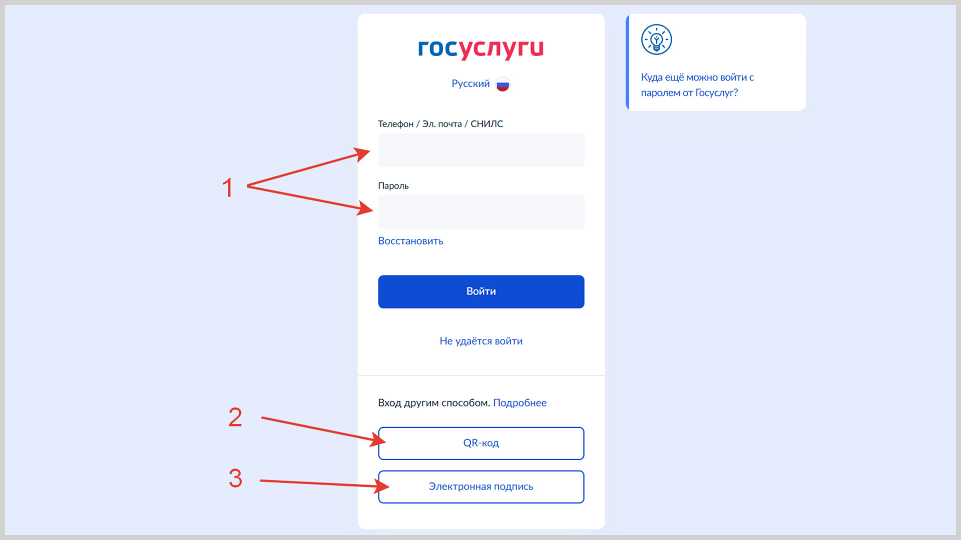 - Путём ввода логина и пароля (основной).